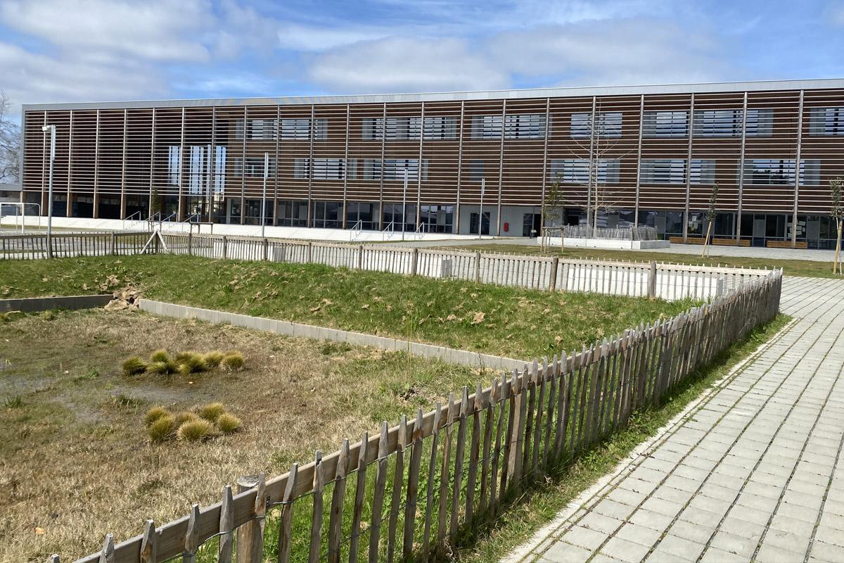 Contexte sanitaire oblige, l’inauguration du collège Jean Racine s’est fait attendre deux longues années, durant lesquelles les 518 élèves ont tout de même pu fréquenter les 6128 m² de surface plancher organisés en trois pôles distincts, se regrouper sous le préau monumental ou profiter de sa cour paysagée plein sud offrant une vue dégagée sur la place de la Liberté d’un côté et le jardin Ty Coat de l’autre.