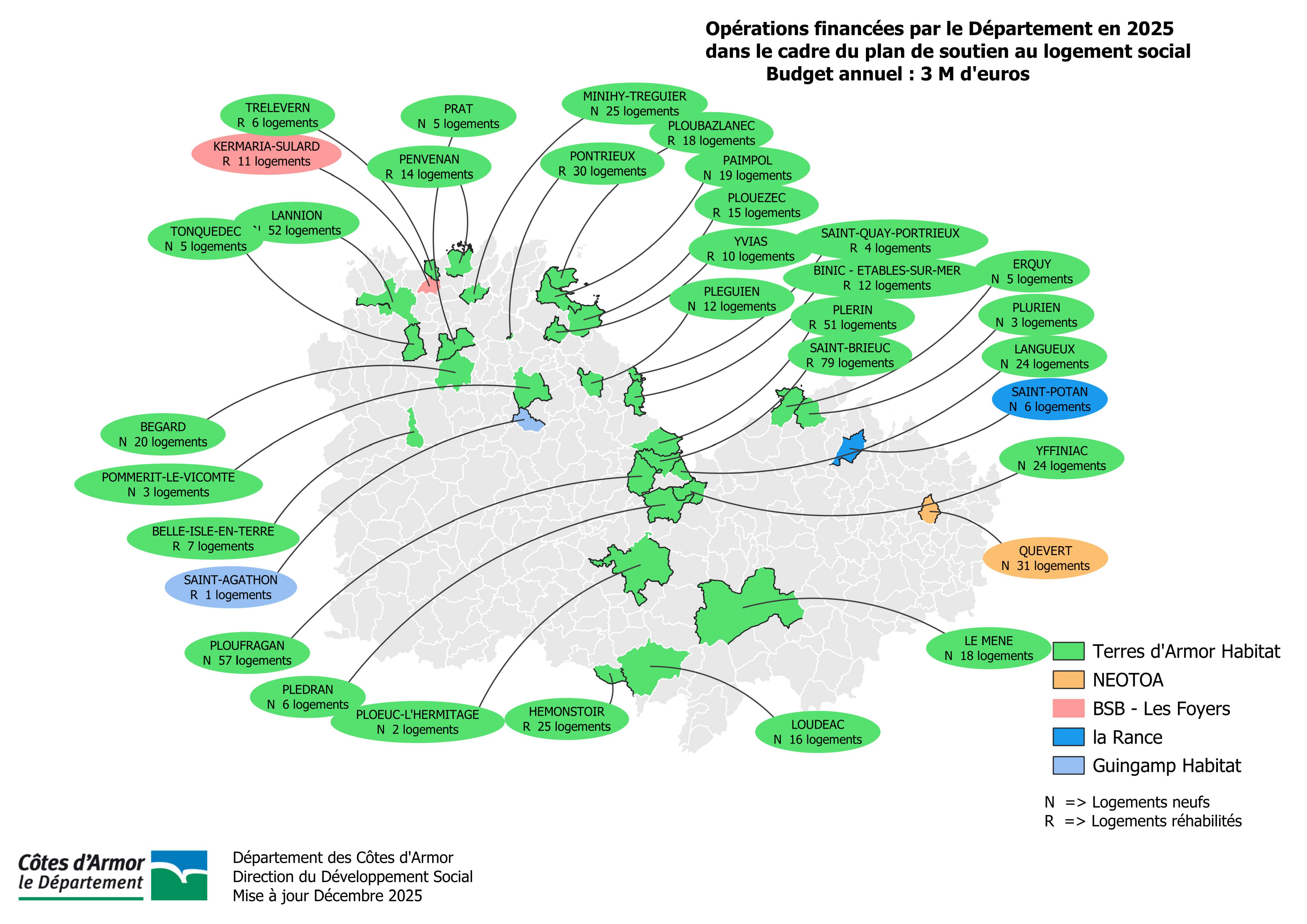 - un budget de 3 millions d’euros alloué annuellement pour construire, réhabiliter et adapter les logements dits HLM (Habitation à Loyer Modéré) dans le cadre d’une convention avec l'office départementale Terres d’Armor Habitat ;