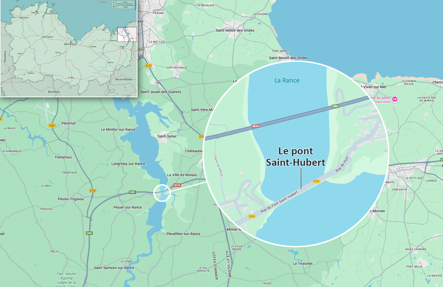 Le pont Saint-Hubert occupe une place singulière dans l’histoire des liaisons entre les Cotes d’Armor et l’Ille-et-Vilaine. Situé entre Plouër-sur-Rance et La Ville-ès-Nonais, il franchit la Rance à un endroit autrefois difficile d’accès. Avant sa construction, les habitants devaient recourir à un bac ou emprunter un long détour pour rejoindre la rive opposée. Au début du XXᵉ siècle, la construction d’un pont devient progressivement un enjeu majeur pour améliorer les échanges, la vie locale et le développement du territoire.